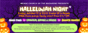 Hallelujah Night is a fun, come and go family event where kids (4yrs-6th grade) play carnival games to win tickets that can be exchanged for prizes in the “Ticket Exchange!”
